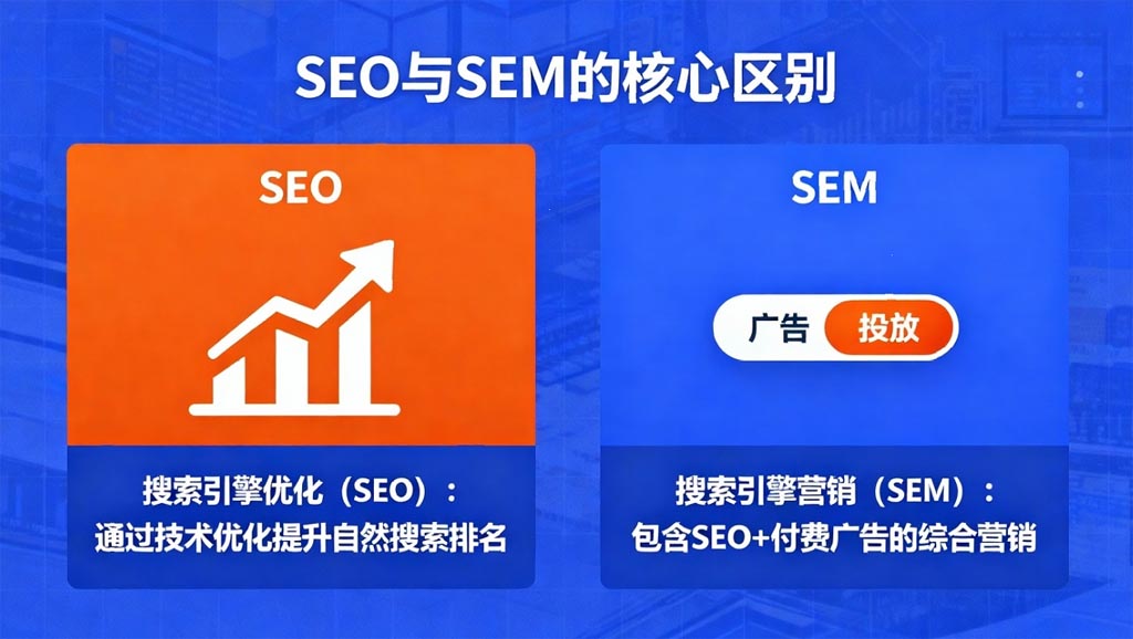 | 对比维度 | SEO(搜索引擎优化) | SEM(搜索引擎营销) |